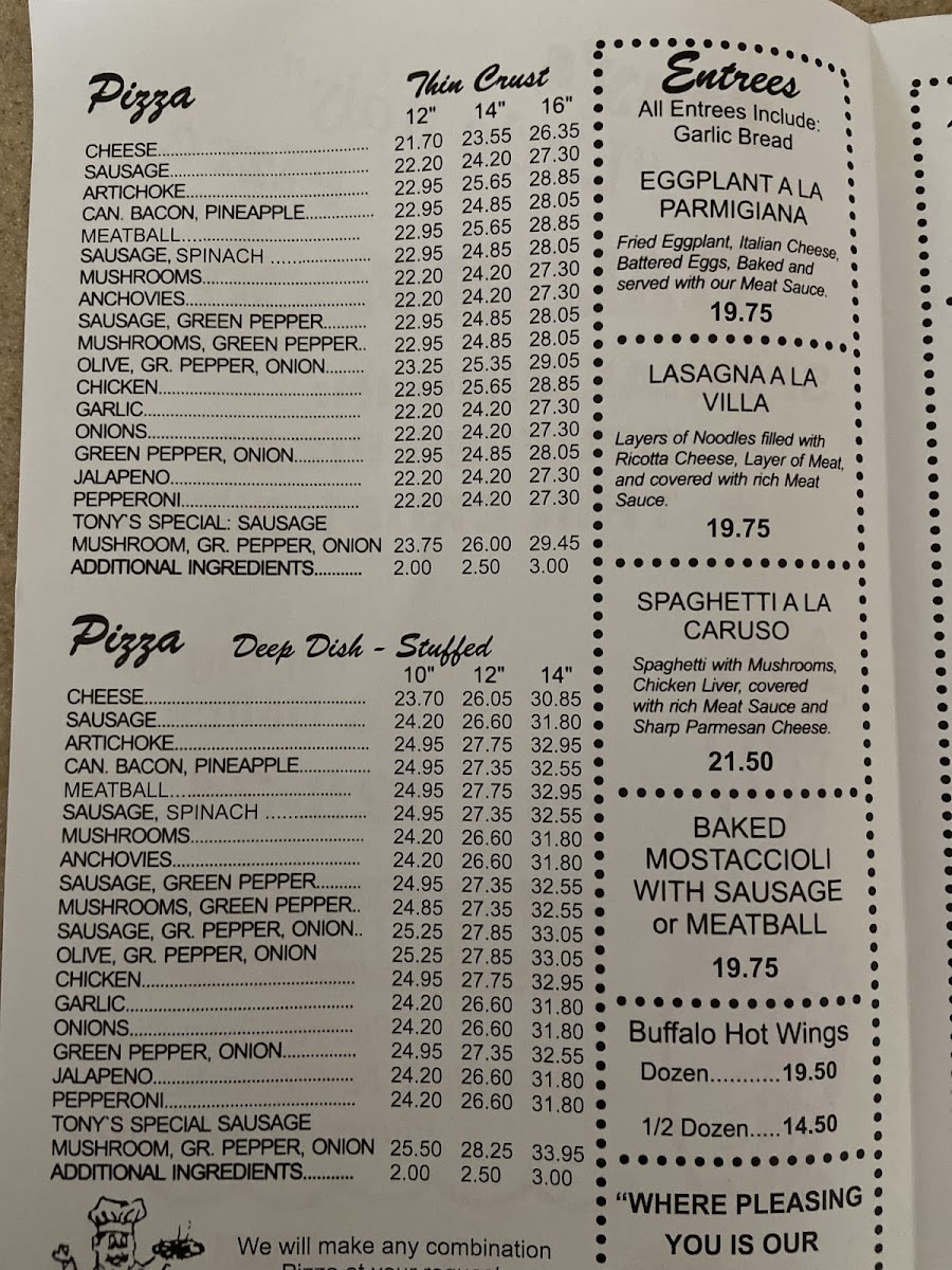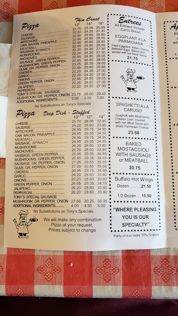 The star of the show at Tony's is undoubtedly the pizza. Known for its hefty portions, the menu boasts a variety of toppings that cater to every taste. It’s hard to resist the classic Cheese or the bold Pepperoni, but the true standout is the Tony's Special Deep Dish. Overflowing with hearty sausage, savory mushrooms, crisp green peppers, and zesty onions, each bite is a symphony of flavors and textures. The crust is expertly cooked, providing a delightful contrast to the abundant fillings — no sogginess here!